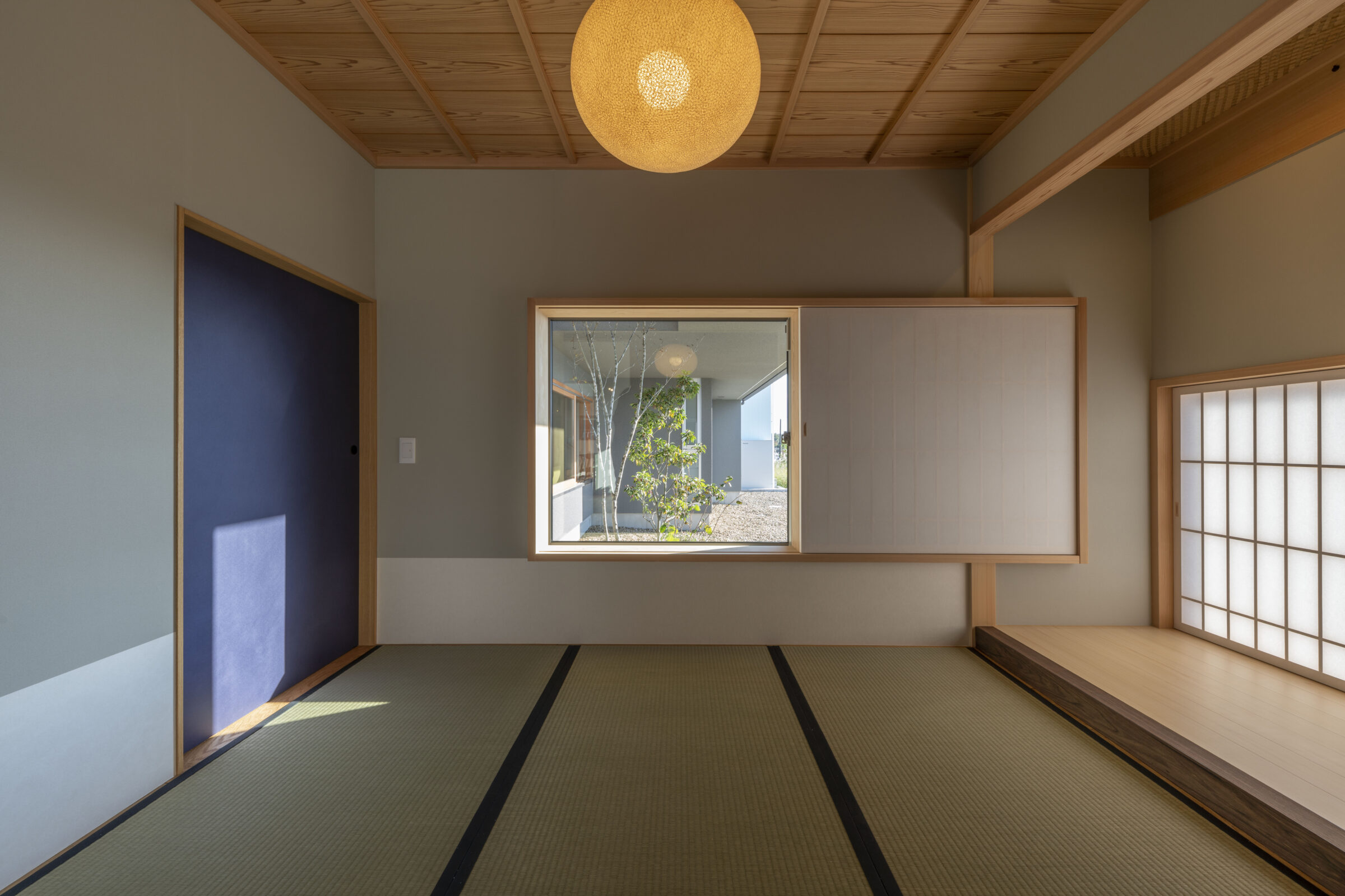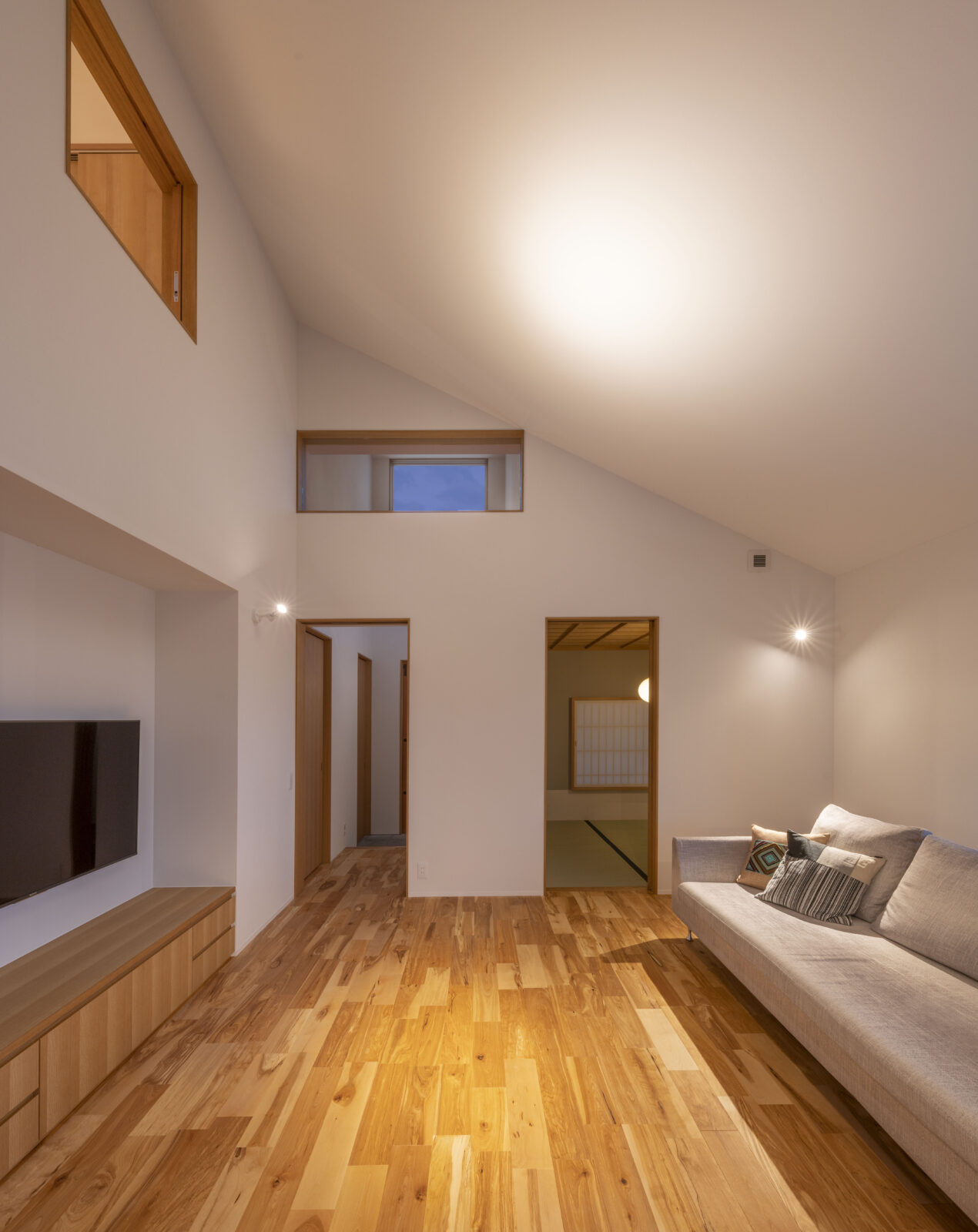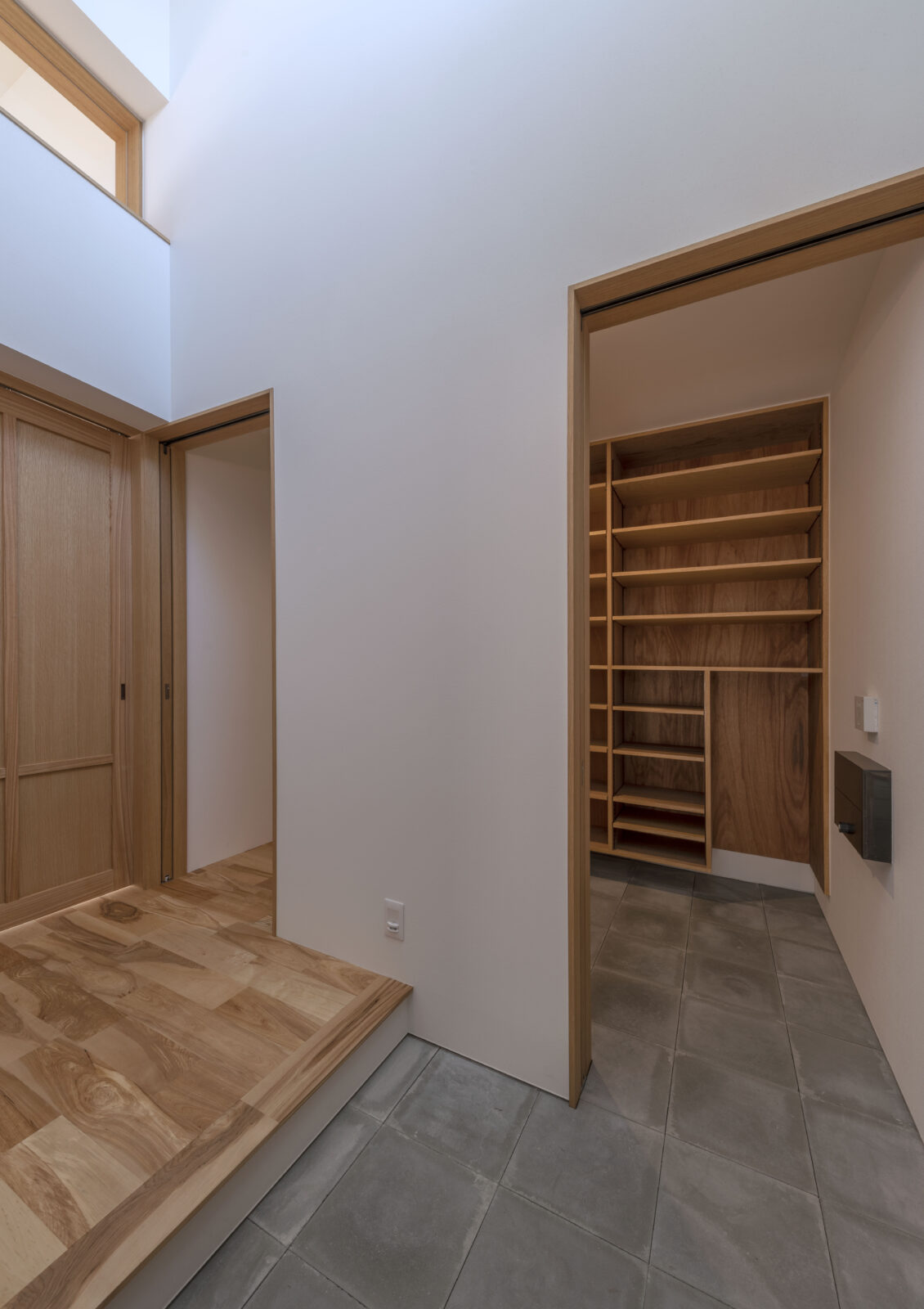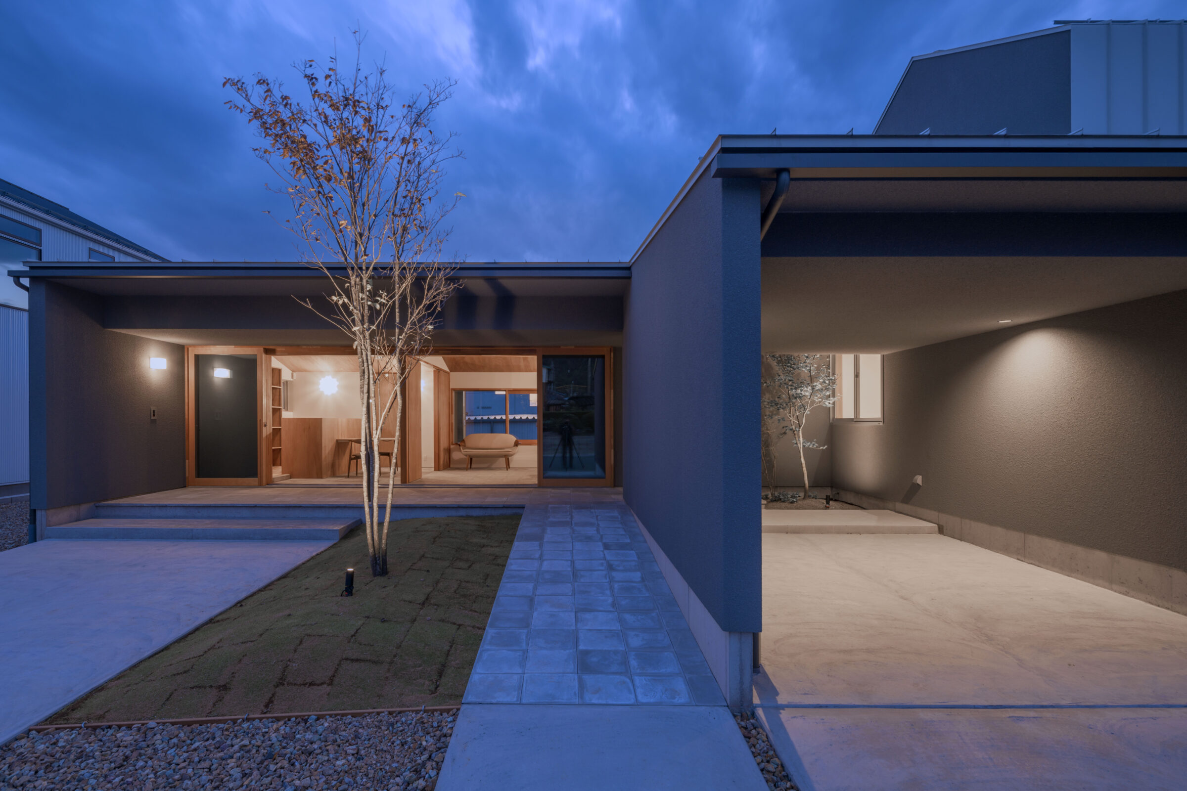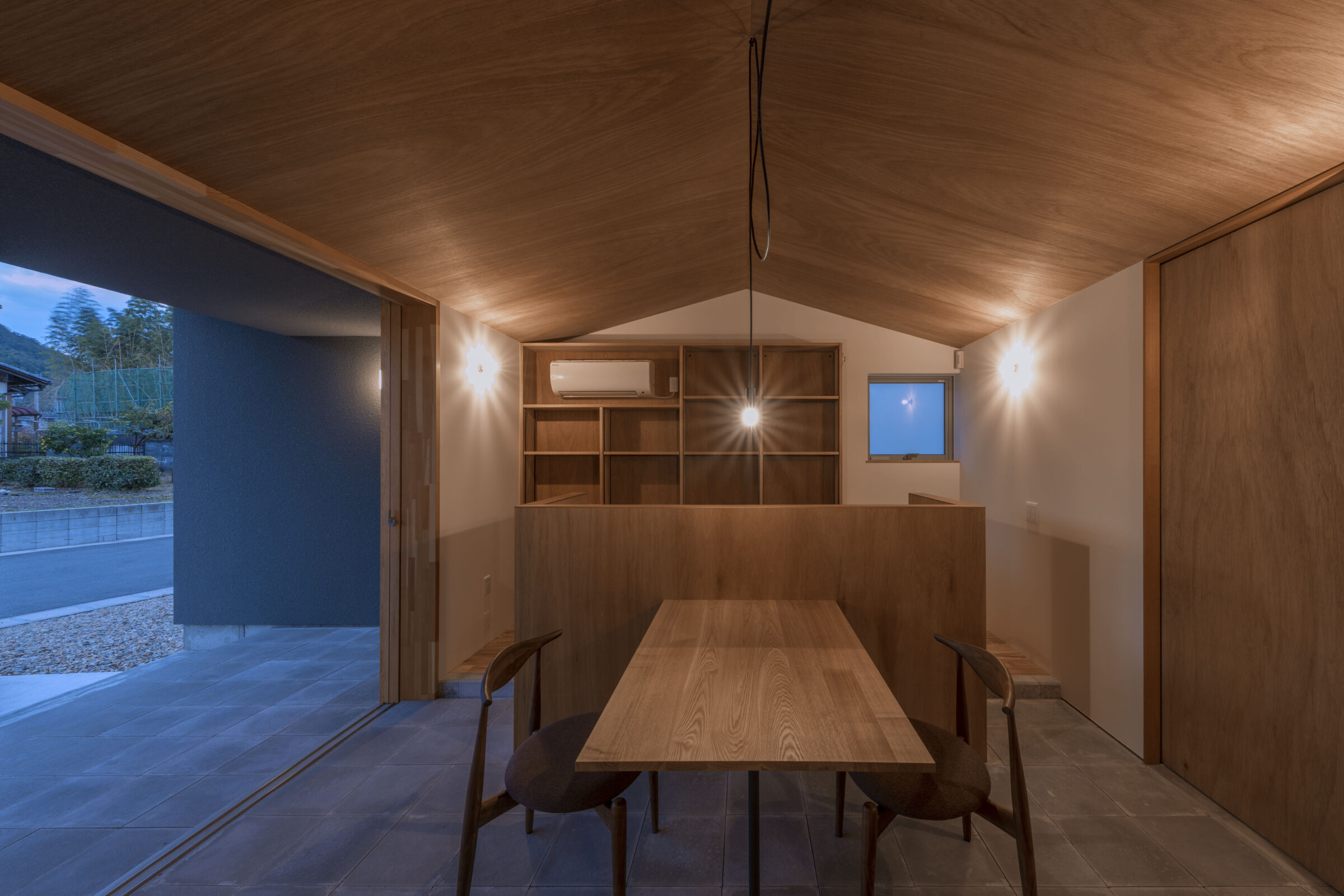 外から見ると中の様子がうかがえず、どんな空間が広がっているのか想像をかき立てられる。静かに佇むこの家は、あえて視線を遮ることで、内部への期待を高めてくれる。扉を開けた先に現れるのは、柔らかな光と木の温もりに包まれた穏やかな空間。バイクガレージや土間スペース、そして和の趣を感じる畳の間など、多彩な居場所が静かに連なり、暮らしに豊かなリズムをもたらしてくれる。外の世界と少し距離を置きながらも、内には開放感と落ち着きが共存するこの住まいは、住む人だけが知る心地よさに満ちている。まるで秘密の場所に足を踏み入れるような、わくわくとした気持ちを誘う家です。