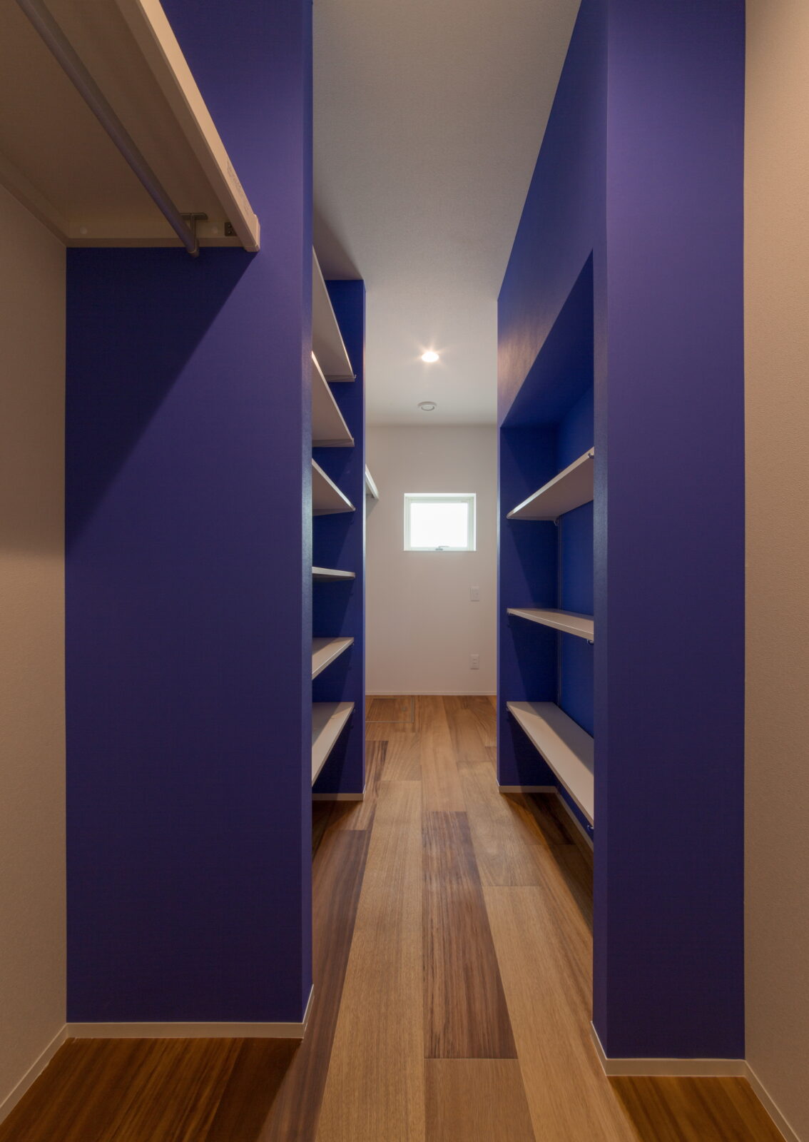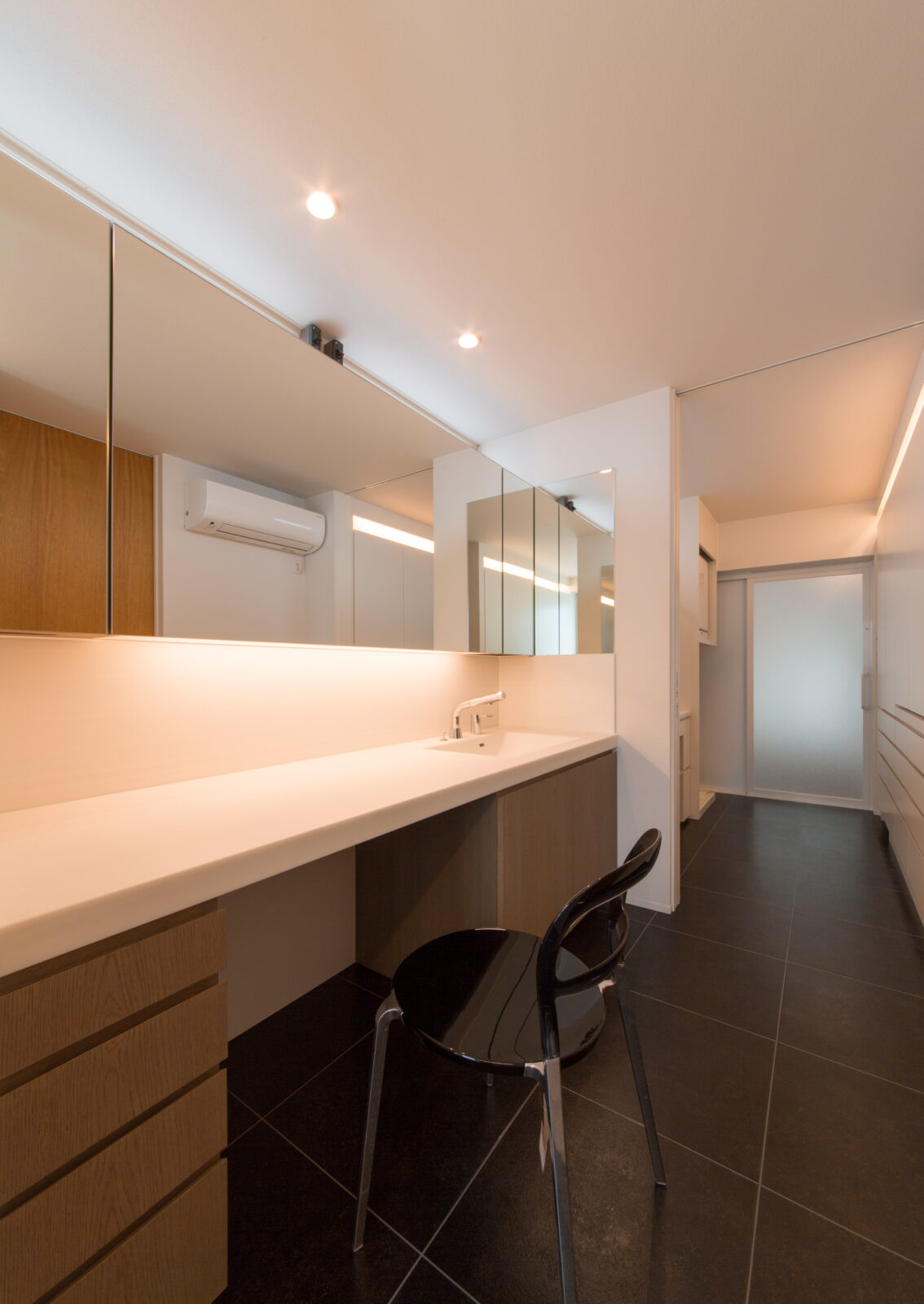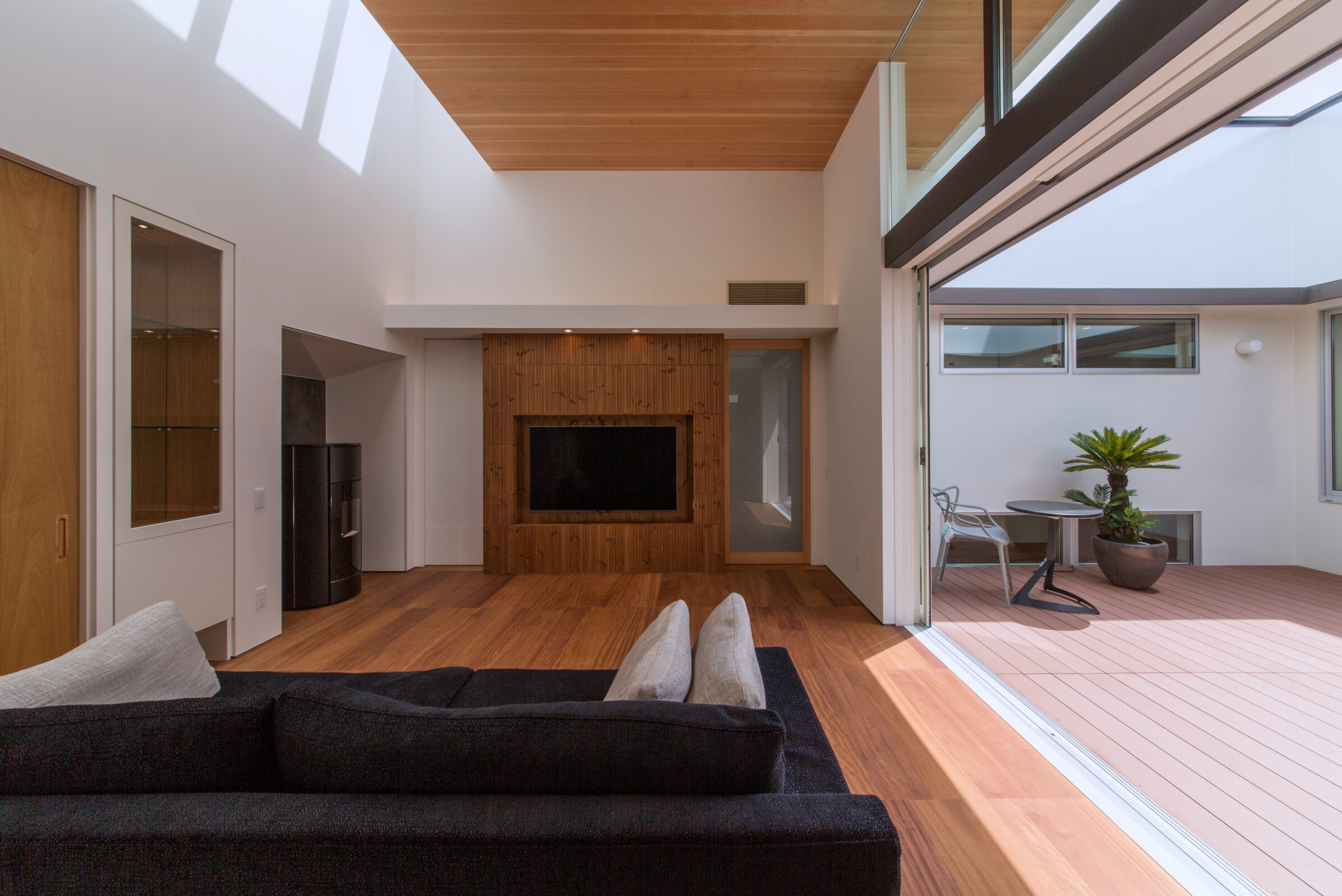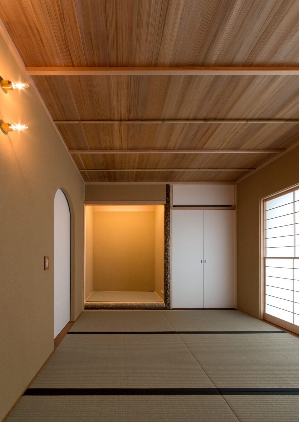 白い塗り壁とグレーの石貼りを組み合わせた、端正で静かな佇まいの平屋です。道路側はあえて閉じた構成とし、プライバシーを守りながらも、木製の格子扉や植栽がやさしい印象を与えています。玄関を入ると、通り土間のようなアプローチが奥へと導き、中庭や坪庭を囲むかたちで各室が配置されています。自然光をたっぷり取り込む高窓や天窓が随所に設けられており、時間帯によって室内の明るさや陰影が美しく変化します。LDKを中心に、水まわりや書斎、個室が緩やかにつながり、家のどこにいても庭の気配を感じられる設計です。素材は木と石を中心に、落ち着いた色合いで統一し、上質ながらも居心地のよい空間を目指しました。
