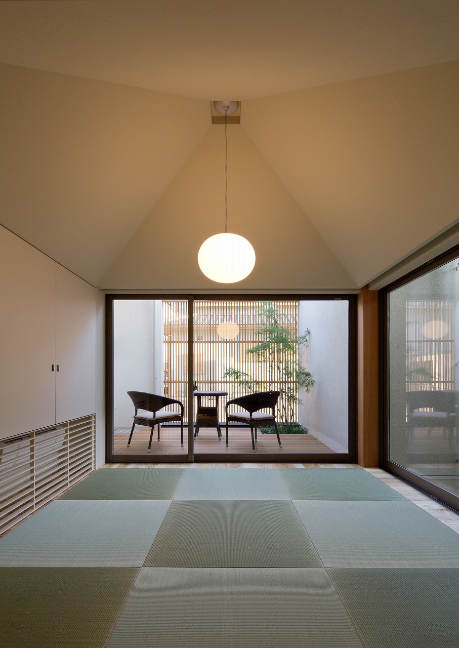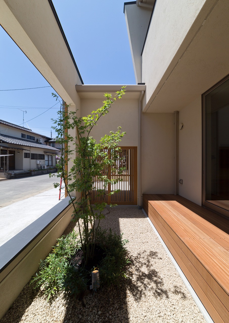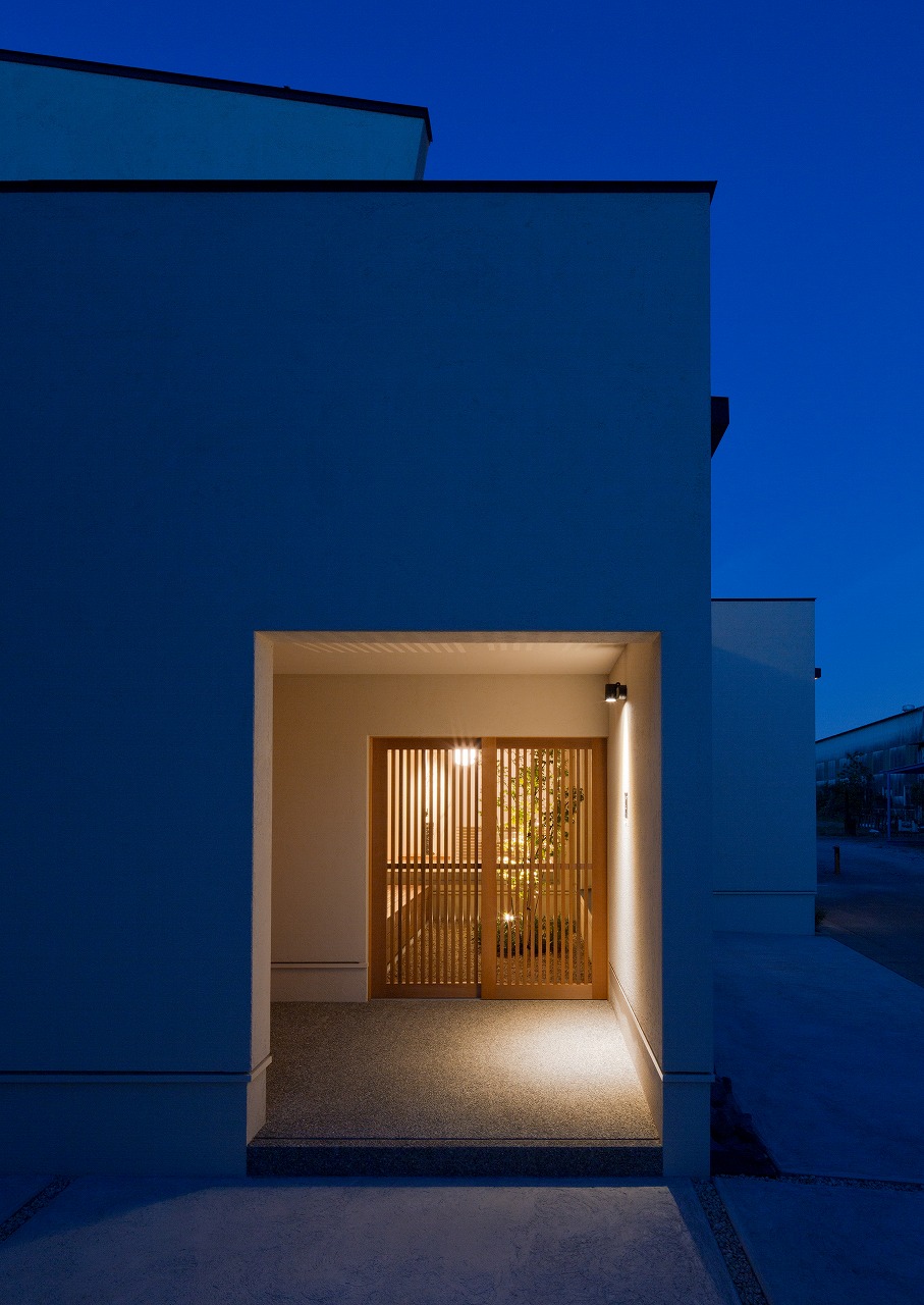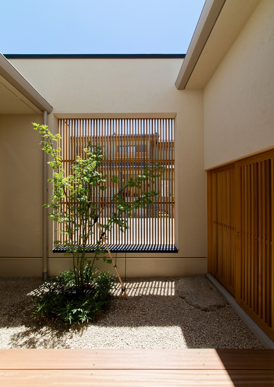 木製格子がやさしく街に溶け込む、凛とした佇まいの住まい。通りからの視線をほどよく遮りながらも、風や光をやわらかく受け入れる設計が、日々の暮らしに穏やかなリズムを与えます。建物の中心に配された光庭を囲むようにリビング、ダイニング、和室を配置し、どの空間にも緑と光が広がる心地よさを演出。日中は自然光がふんわりと室内を照らし、夜には植栽の陰影が静かに浮かび上がります。直線的で洗練された構成のなかに、涼やかさと落ち着きが調和し、心地よく静かな時間が流れる住まいとなりました。