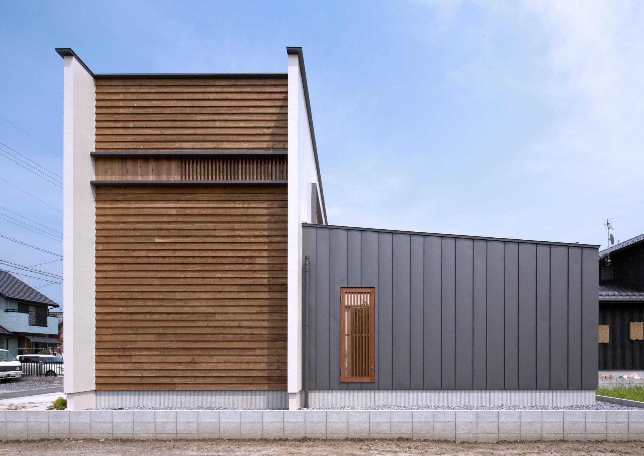 素材は塗壁と杉、金属の外壁を組み合わせ、時間とともに変化する風合いも楽しめるよう設計されています。