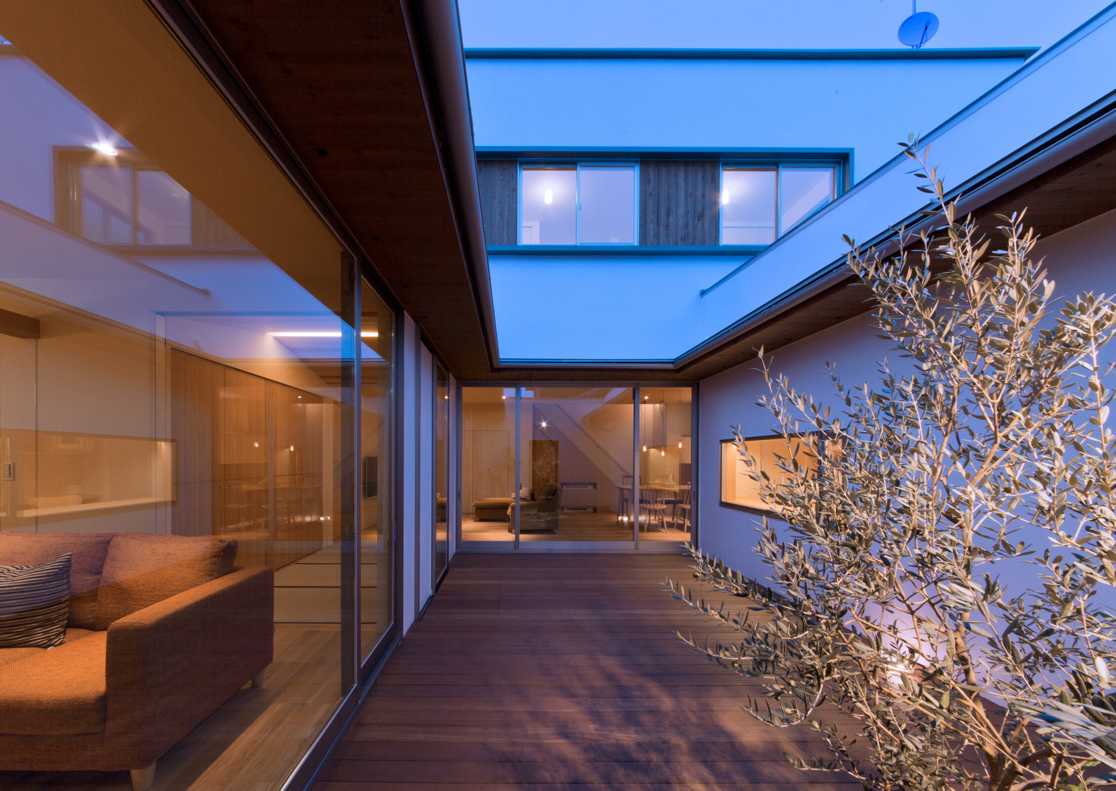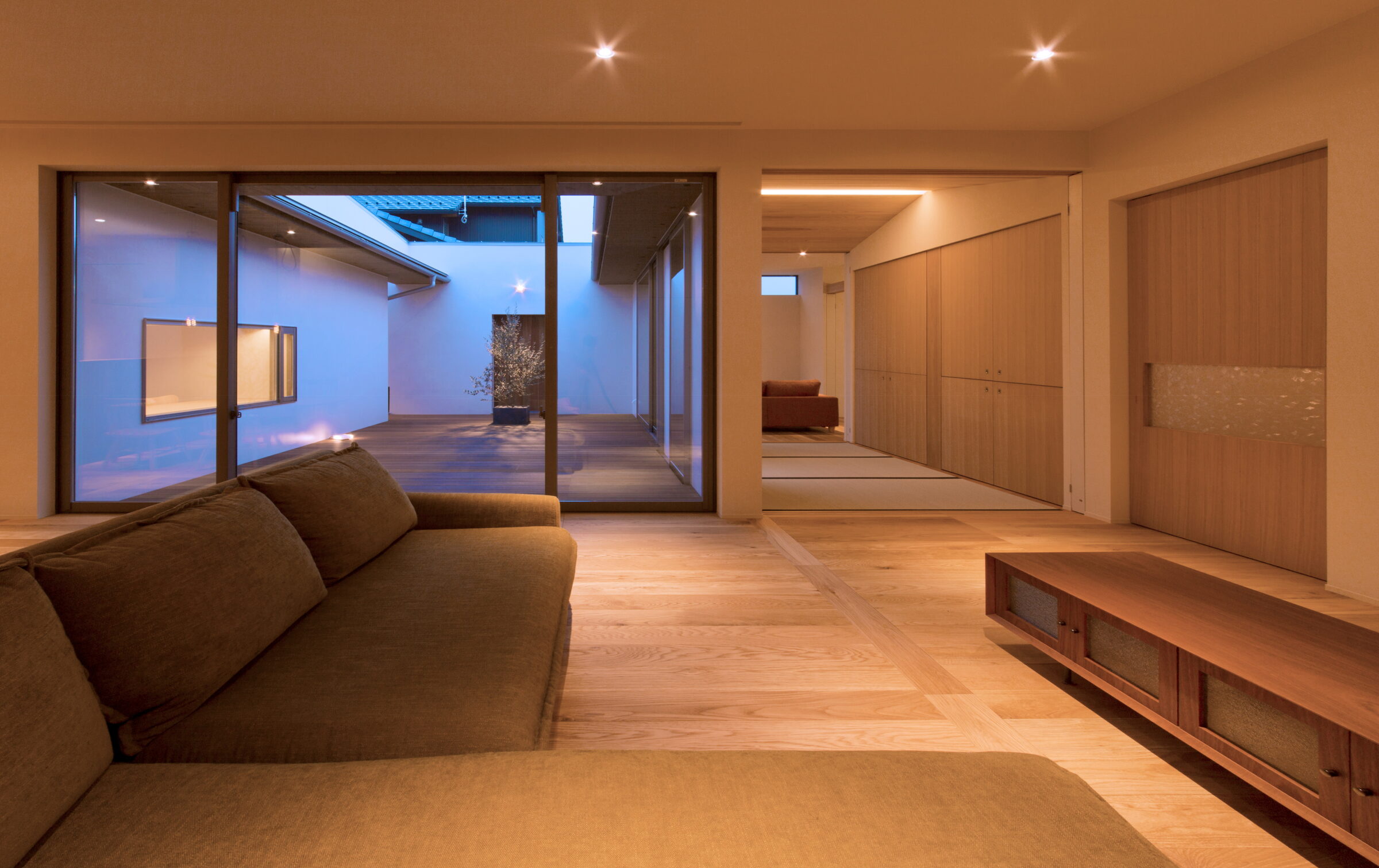 リビング・和室・書斎など、それぞれの居場所が中庭を介してゆるやかに繋がり、家族の気配をどこかで感じられる安心感を生み出します。