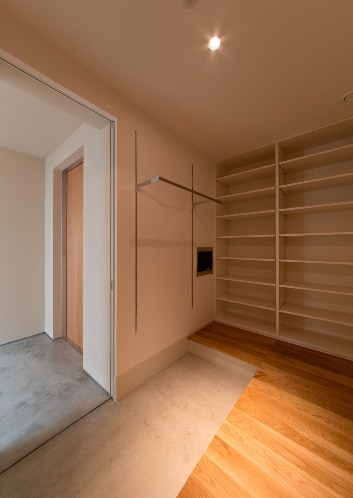 高さのある玄関ポーチから一歩足を踏み入れると、やわらかな質感の木と光が迎えてくれます。