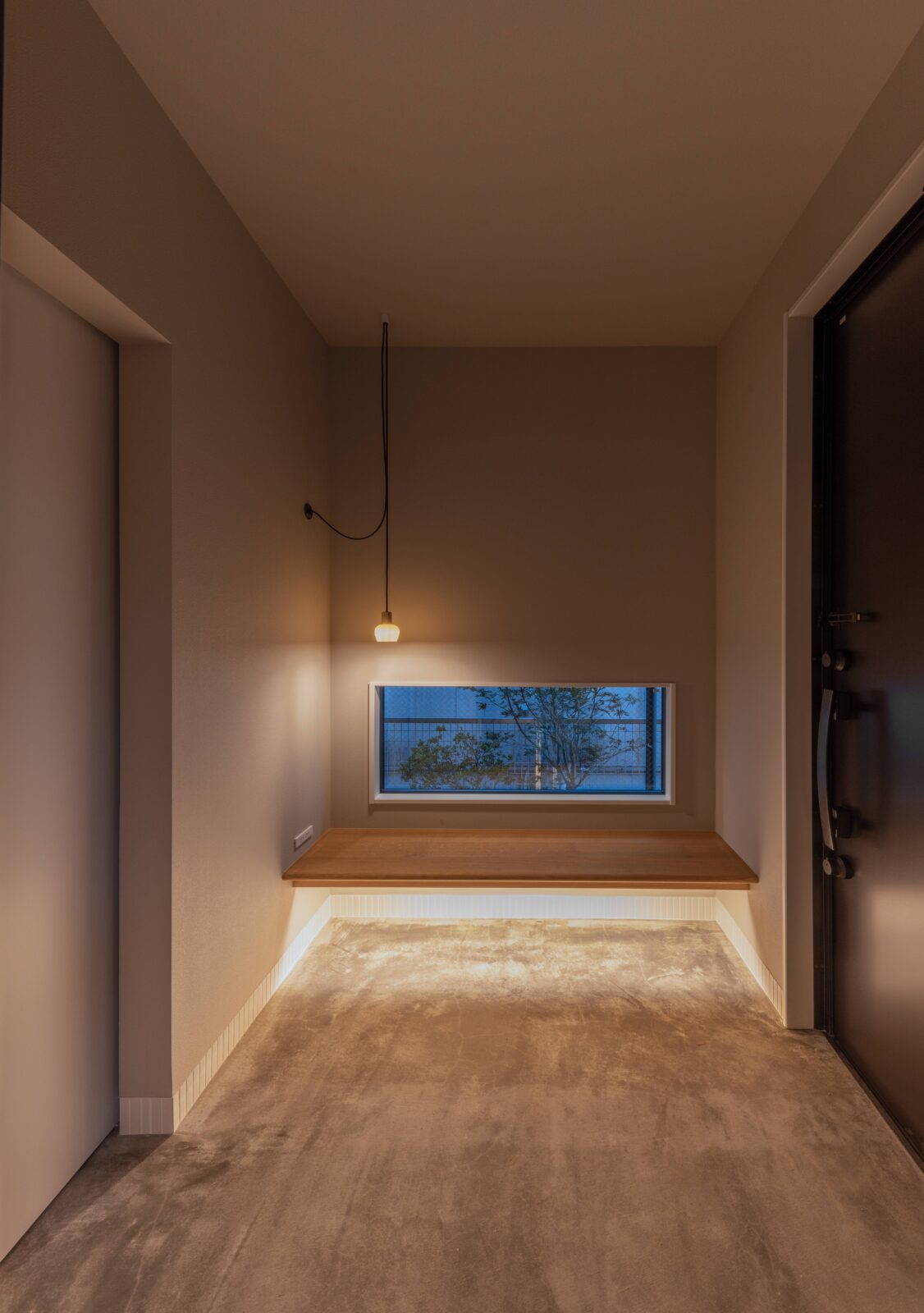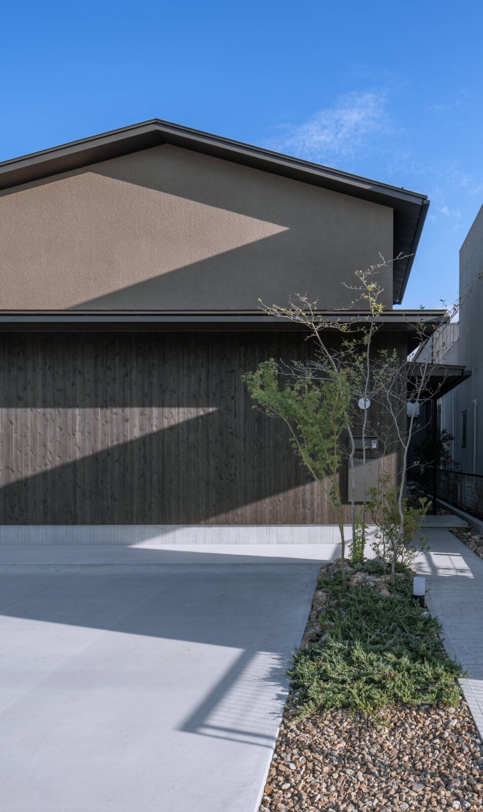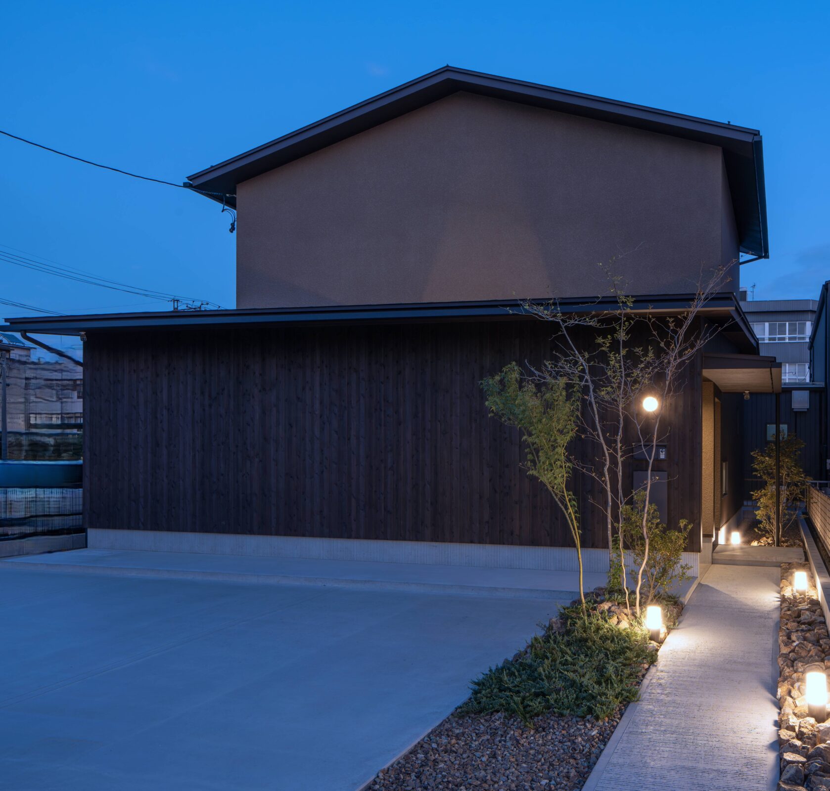 閉鎖的な佇まいで落ち着いた色相の外壁。道路からのプライバシーも確保され玄関へは照明が導きます。