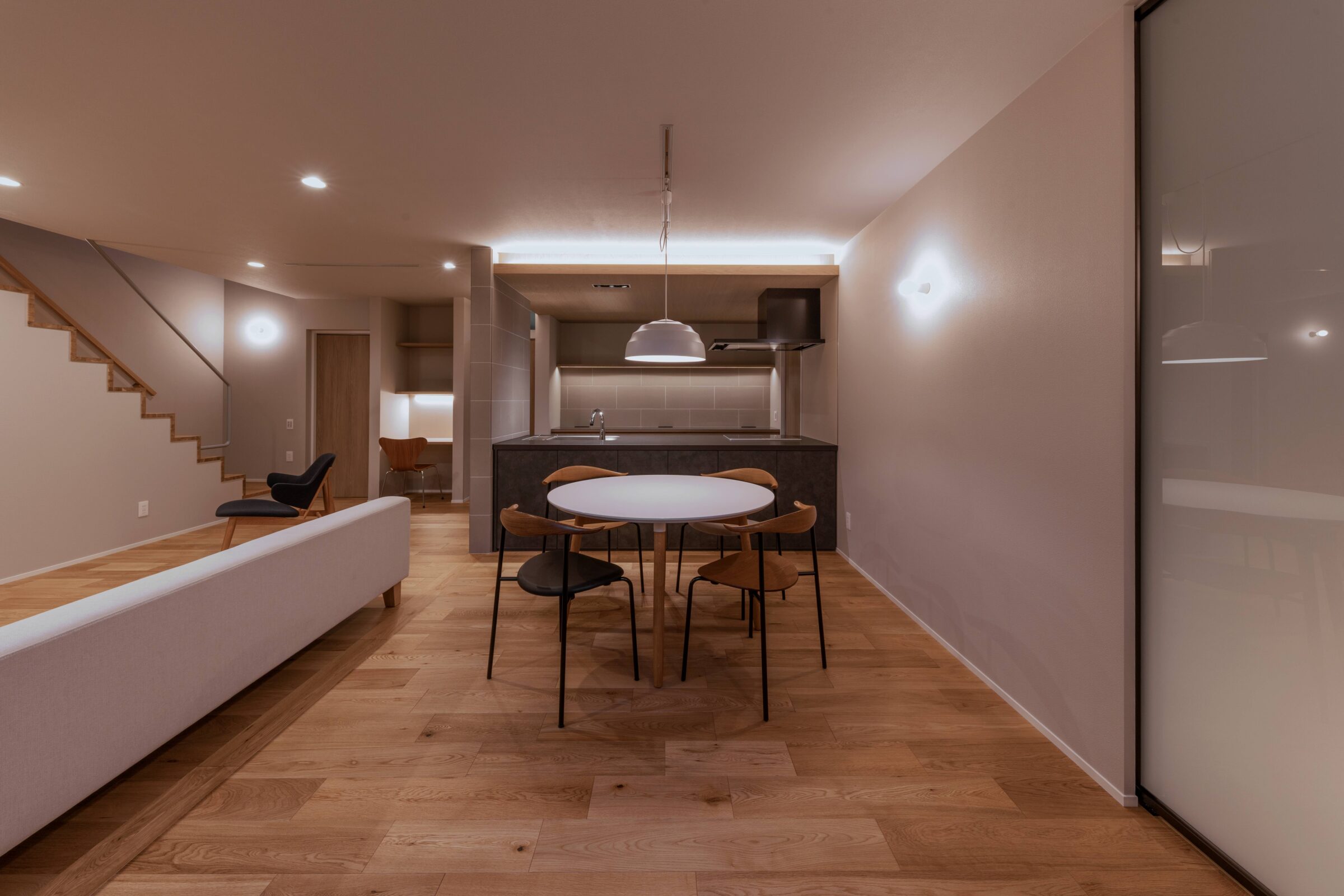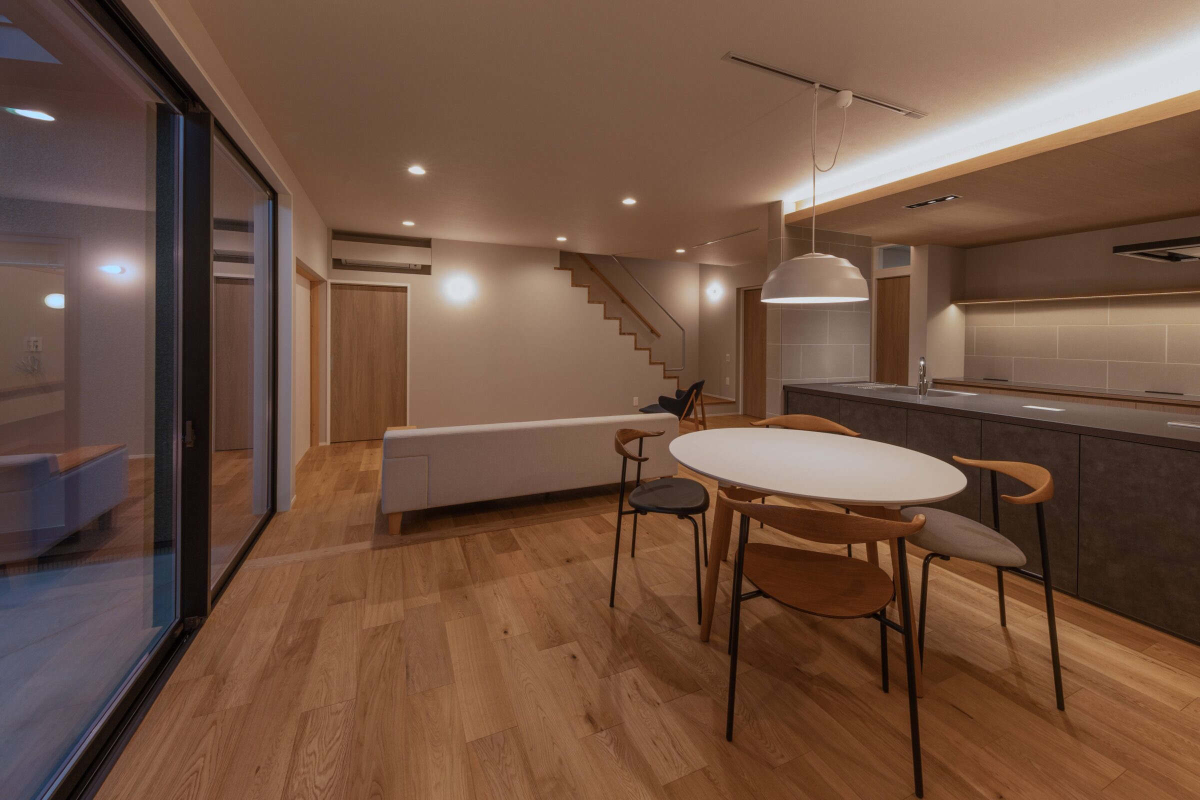 リビングは、多種の素材感が喧嘩することのないよう、同系色でまとめ統一感ある空間に。